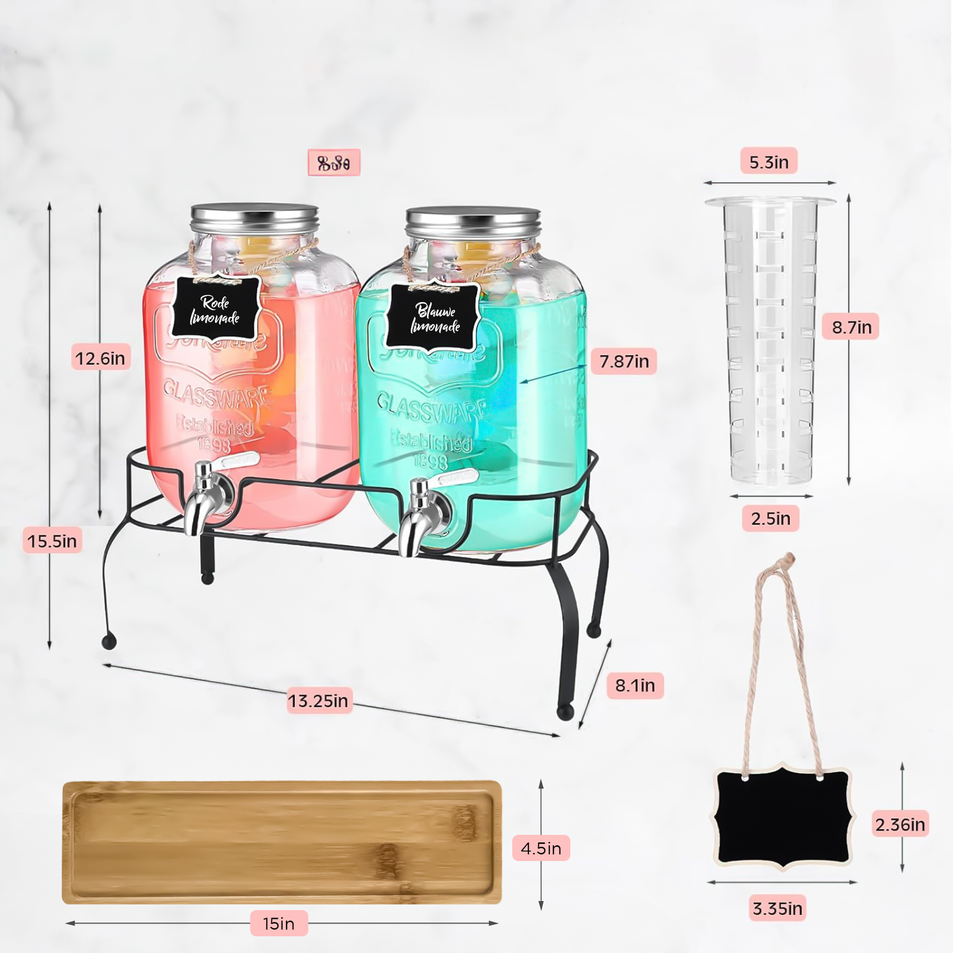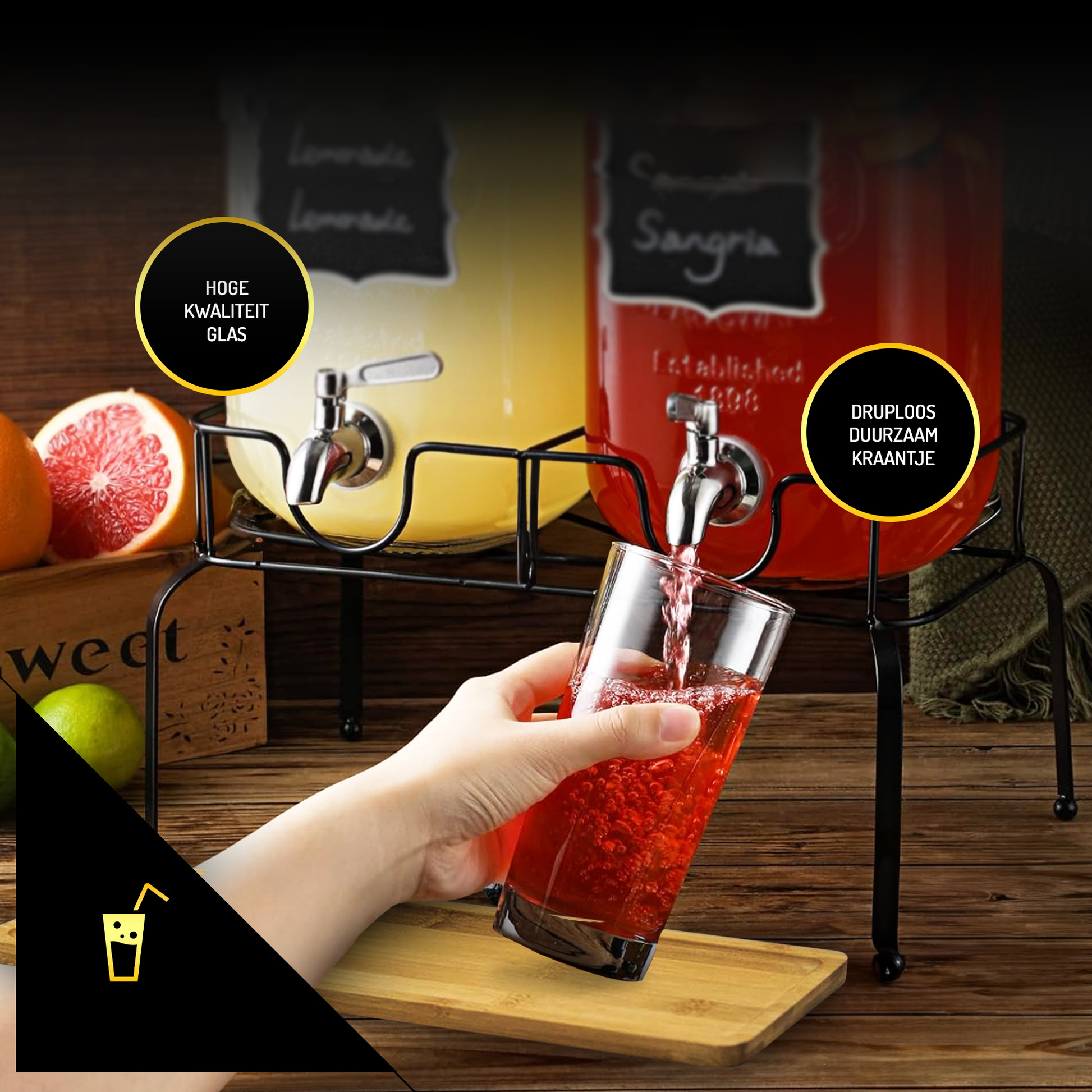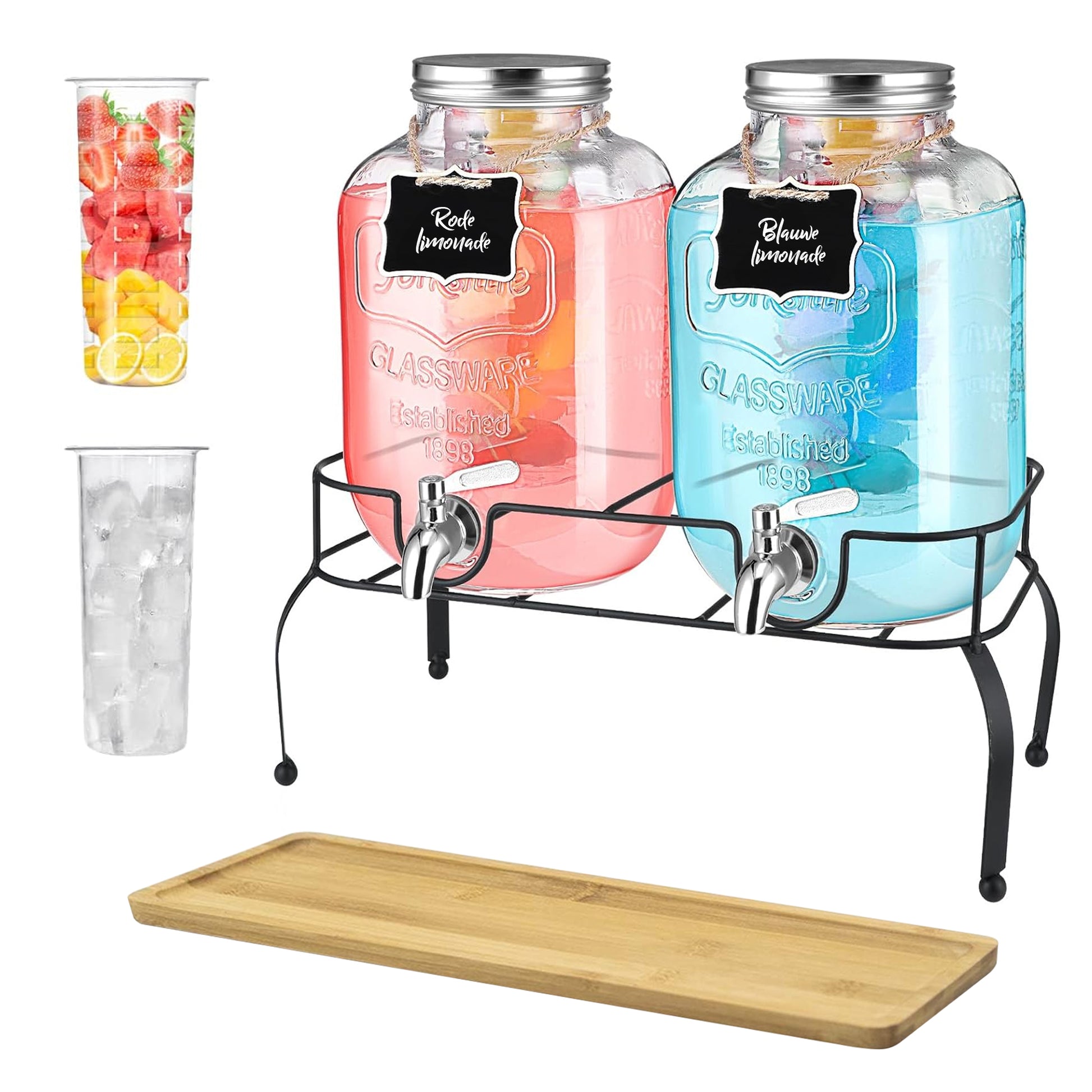 - Dubbele Drankdispensers: Twee robuuste glazen potten van elk 4 liter, met tapkraantjes zorgen voor een gestroomlijnde bediening en geven uw gasten de vrijheid om zelf te tappen zonder morsen.