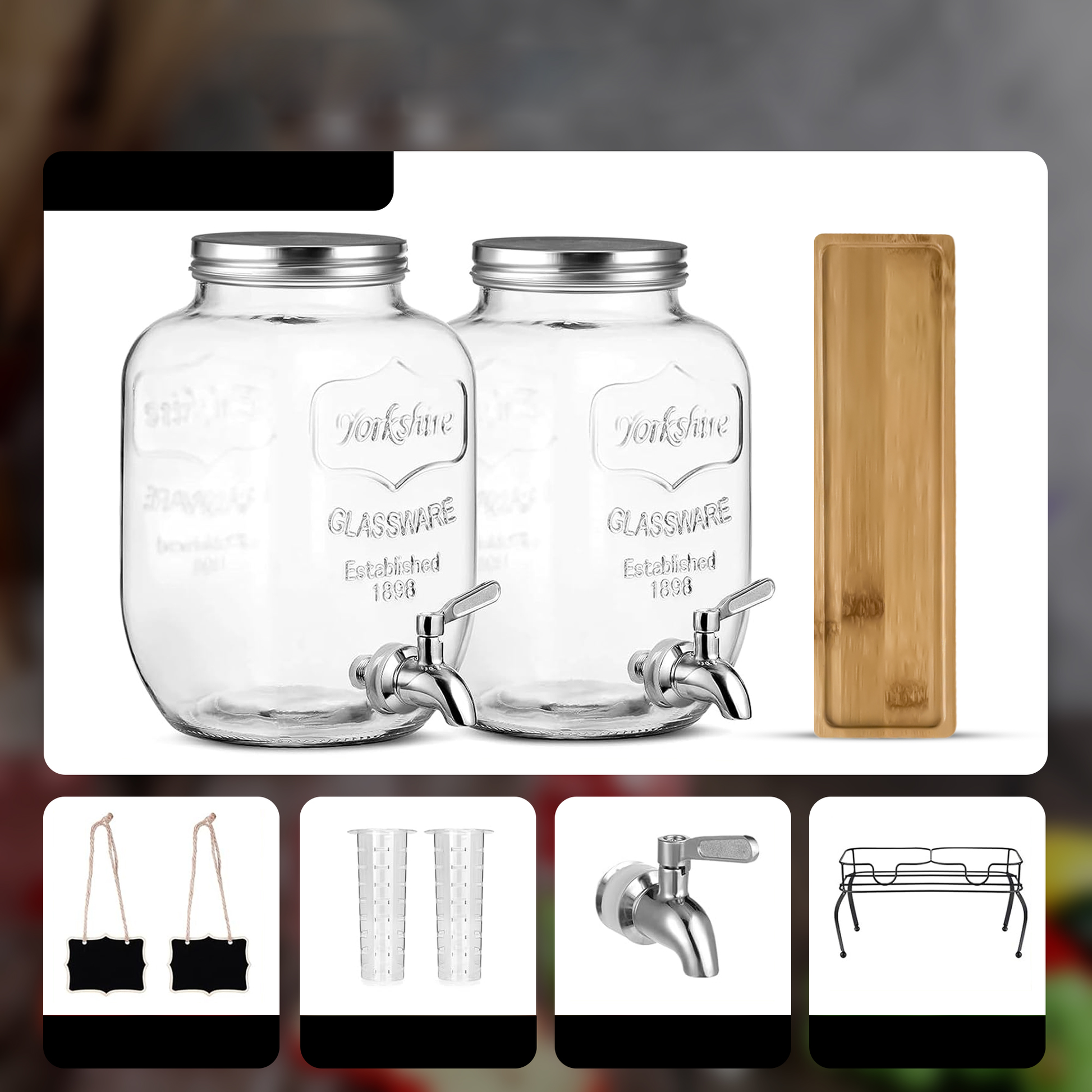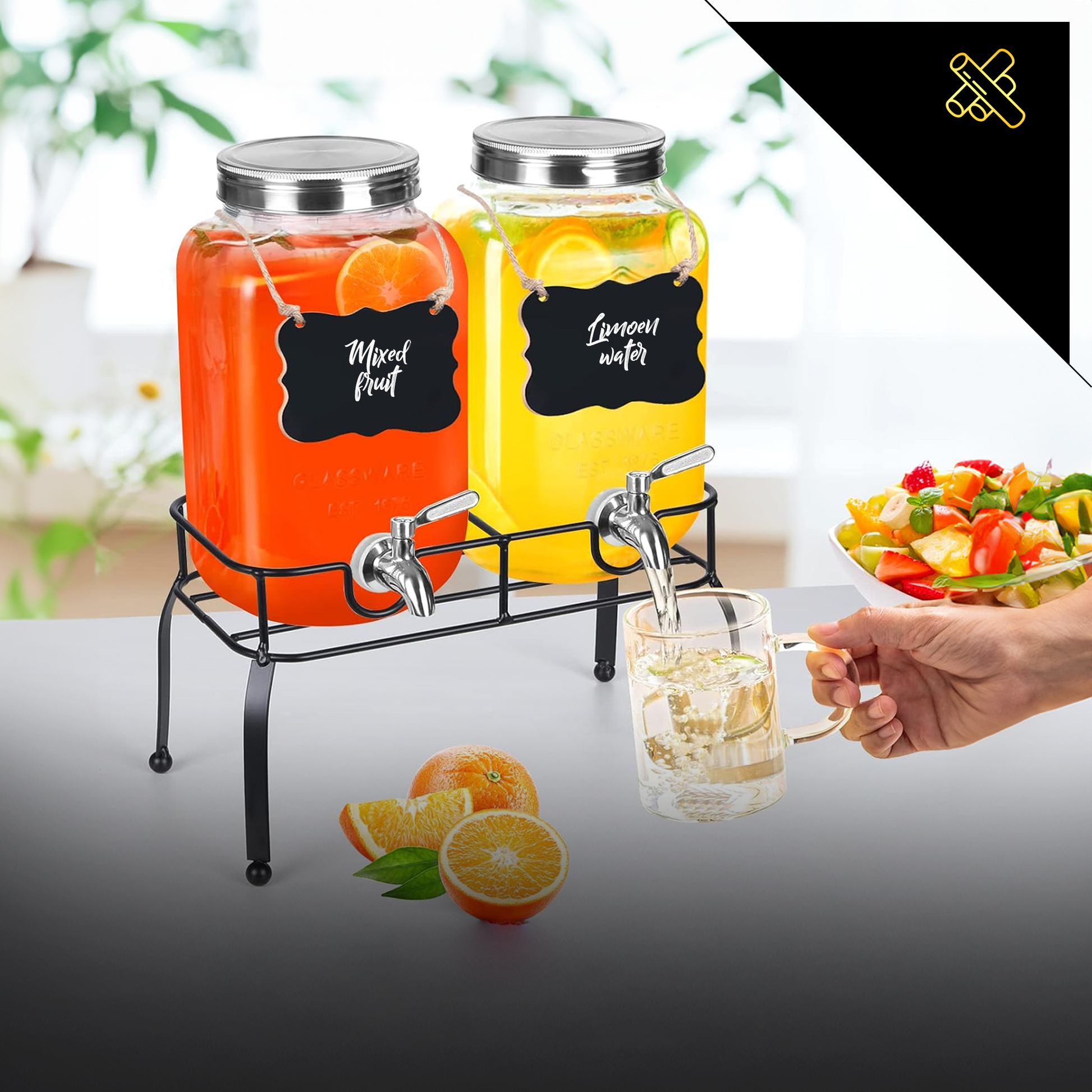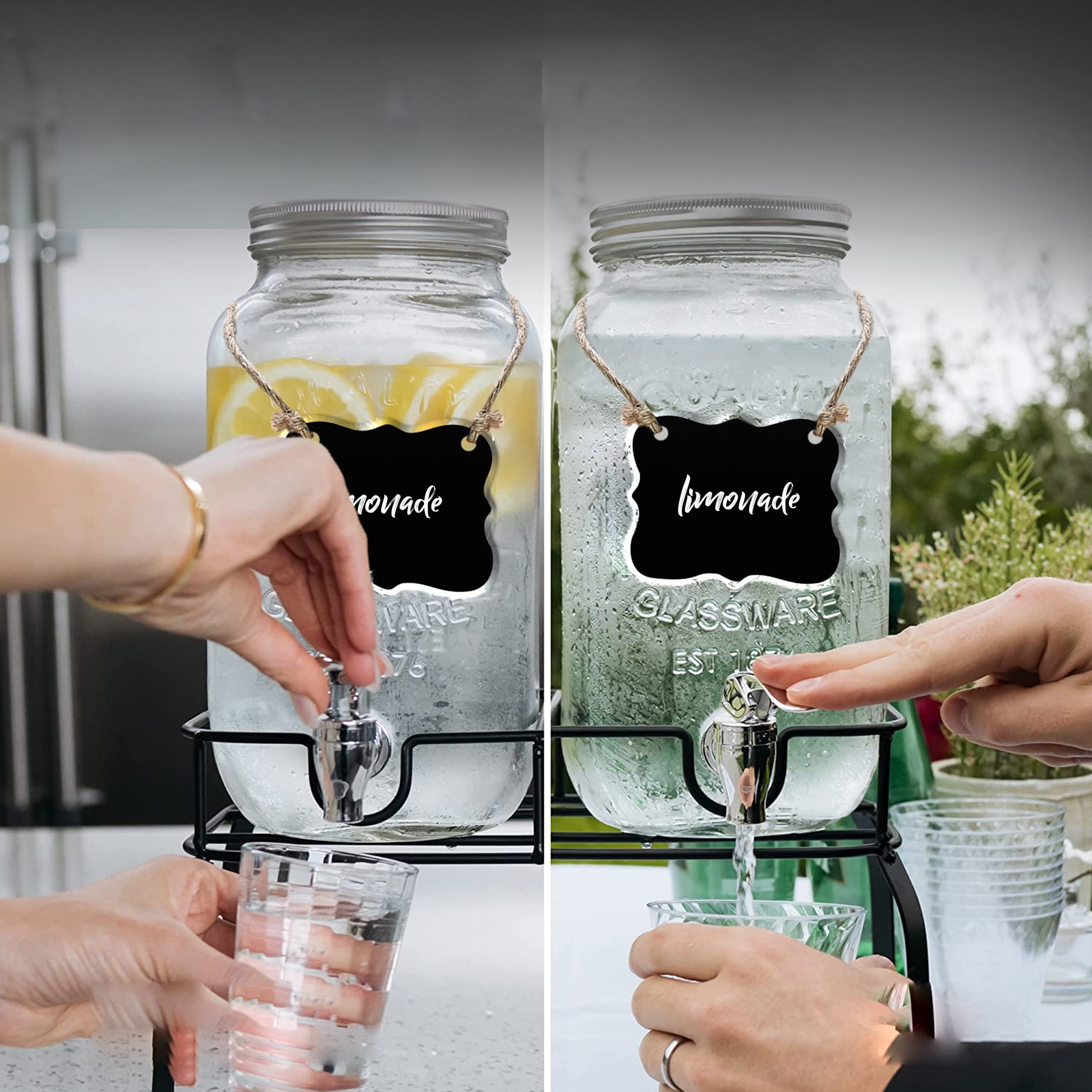- Dubbele Drankdispensers: Twee robuuste glazen potten van elk 4 liter, met tapkraantjes zorgen voor een gestroomlijnde bediening en geven uw gasten de vrijheid om zelf te tappen zonder morsen.